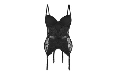 Corselet em renda preta sobreposta em duplo e com detalhes em laço da Água Fresca Lingerie. Possui fechos nas costas e alças reguláveis revestidas em cetim. Possui ligas embutidas para ser usado com meias 7/8. Preço sugerido: R$ 149,00