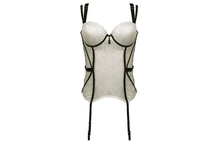 Espartilho off-white da Belles, com detalhes elásticos pretos no tule branco rendado. Possui leve transparência na parte da frente e nas costas. Preço sugerido: R$ 239,90