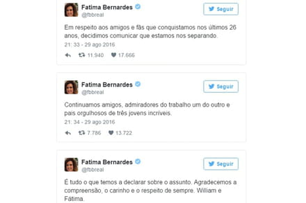 "Continuamos amigos, admiradores do trabalho um do outro e pais orgulhosos de três jovens incríveis. É tudo o que temos a declarar sobre o assunto. Agradecemos a compreensão, o carinho e o respeito de sempre. Fátima e William", completou o agora ex-casal.