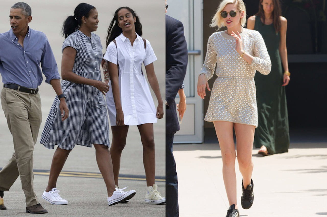 A ideia, que pode parecer heterodoxa à primeira vista, tem ganhado o look das estrelas de street style - nada como o conforto de um tênis entre a correria dos desfiles! - e também de celebridades, até as mais elegantes como Michelle Obama. Em recente viagem com a família, a primeira-dama americana mostrou que chique é ser confortável ao descer do avião de vestido preto e branco com um par de Converses brancos nos pés. Kristen Stewart é outra fã, e uma das responsáveis por quebrar a barreira dos sneakers no tapete vermelho, quase sempre acompanhados de curtinhos Chanel bordados.