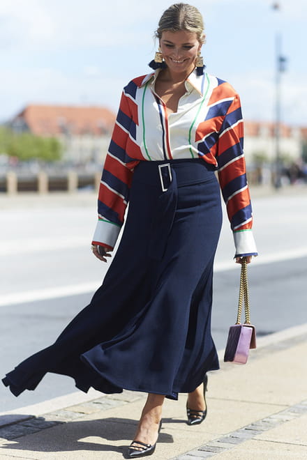 Esta combinação de mix de listras e saia midi é sinônimo de bom gosto em qualquer ocasião. Especialmente em passeios à beira-mar ou eventos no final da tarde. Neste look, o cinto não "conversa" com a blusa e, sim, aparece como um complemento discreto na saia.