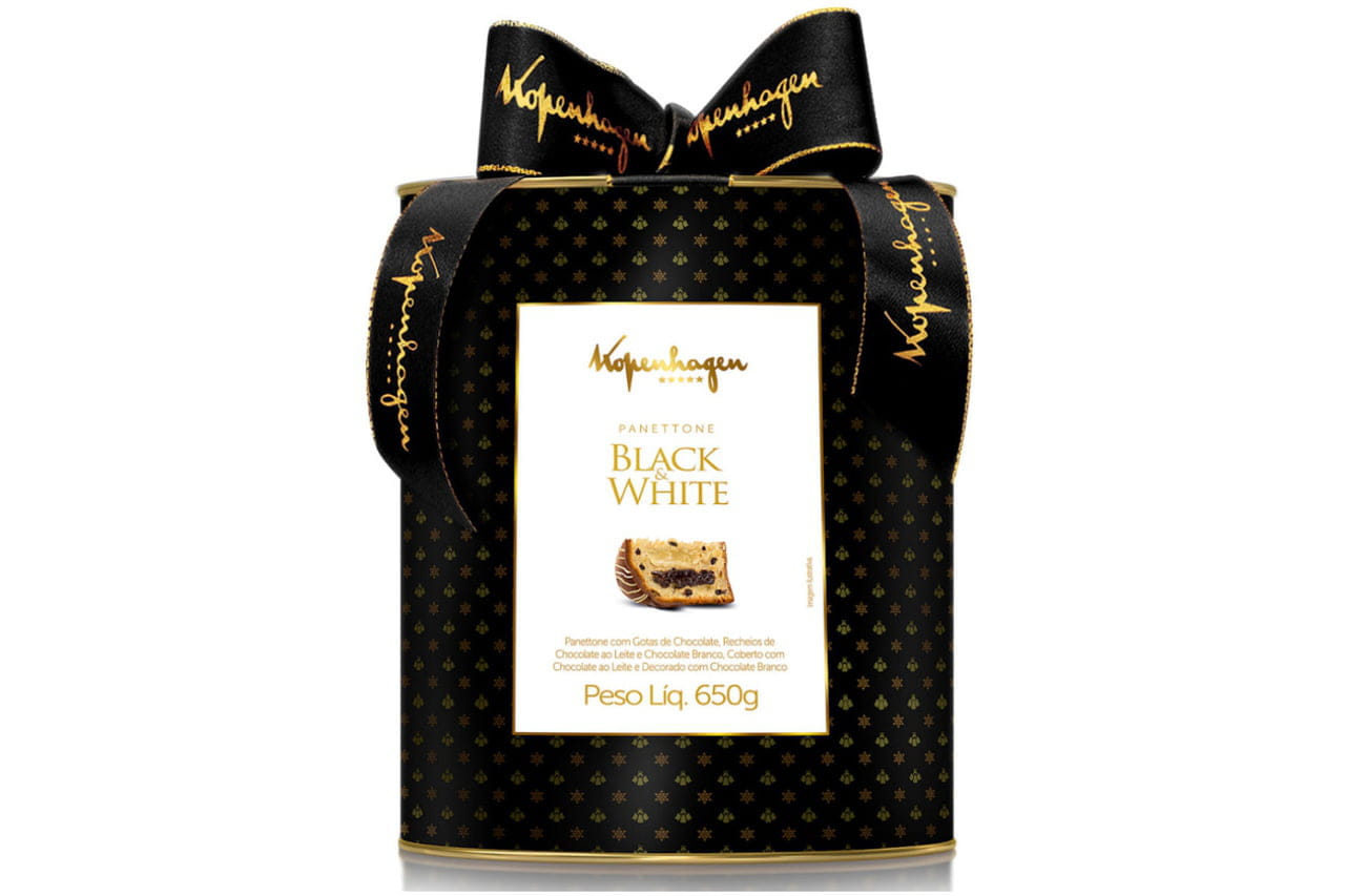 Os chocólatras de plantão vão gostar da novidade em dose dupla que a Kopenhagen preparou para 2016. A nova linha natalina da marca traz o Black & White, panetone com gotas de chocolate, recheado com chocolate ao leite e chocolate branco. A dobradinha também vem na cobertura, feita com os dois tipos de chocolate. Preço: R$ 74,90 (650 g).