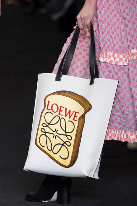 A espanhola Loewe criou uma linha com influências sixties, meio Dolce Vita. A shopping bag com o toast é bem-humorada, quase uma ode à pop art!