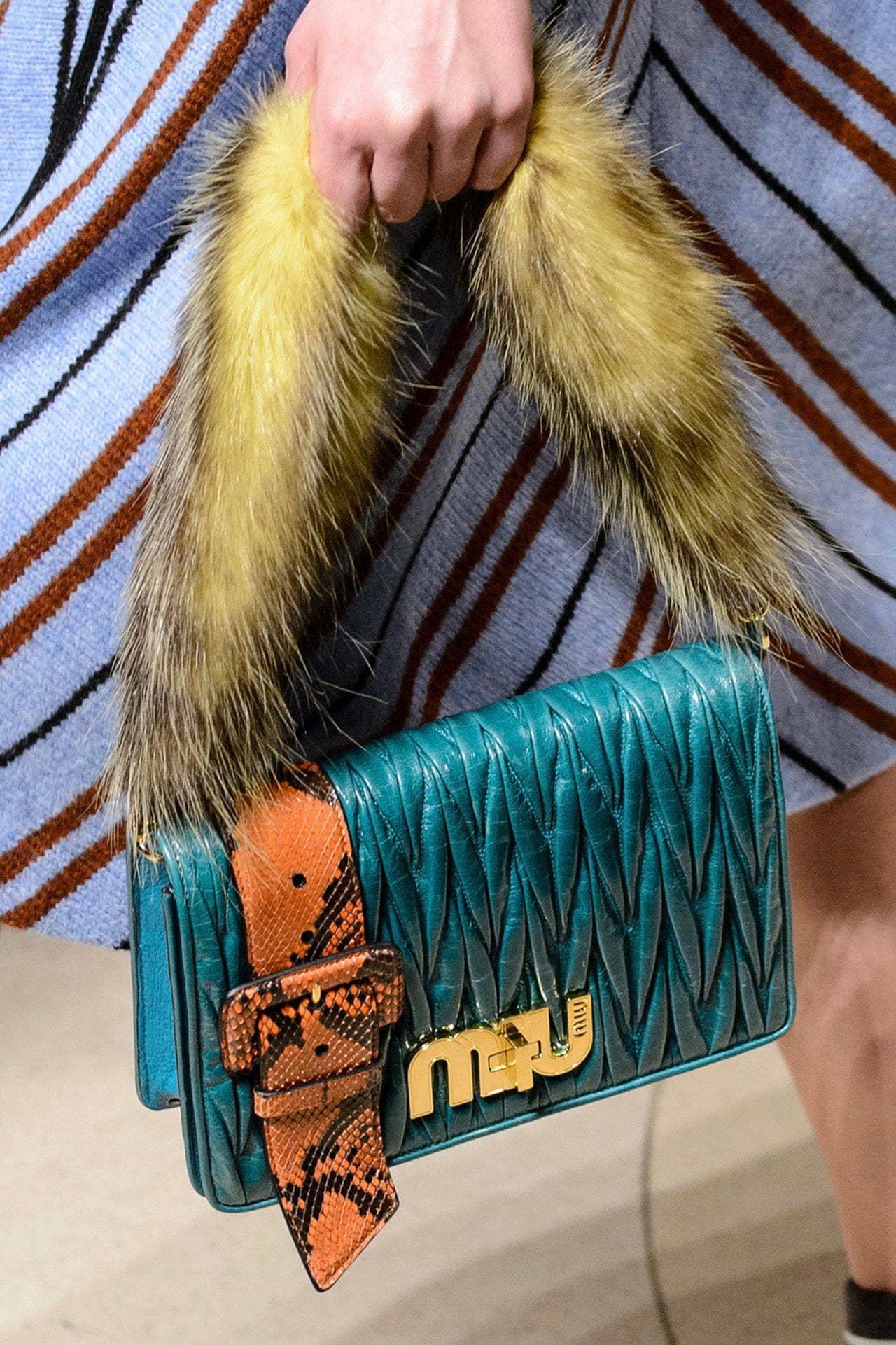A Miu Miu também entra na categoria criadora de maravilhosas bolsas originais, como esse modelo de couro com alça de pele, o grande tema da próxima temporada de Inverno. A mistura de materiais e cores confere modernidade a esse modelo de bolsa, que tem tudo para ser um must have nos dias mais frios do ano.