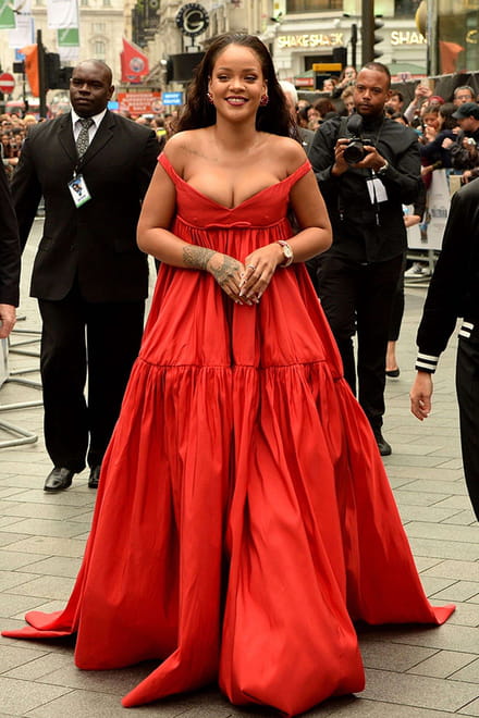 Rihanna escolheu um look pra lá de ousado na pré-estreia do filme "Valerian e a Cidade dos Mil Planetas" nesta segunda-feira (24), em Londres. A cantora usou um vestido vermelho super decotado, que quase deixou seus seios à mostra.