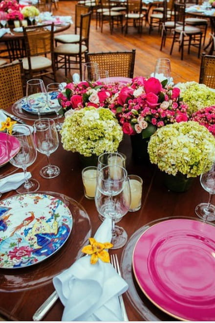 "Amei as orquídeas que são porta-guardanapo e braceletes de lembrança para as convidadas", escreveu a atriz em seu Instagram. Os pratos de cores diferentes completam a decoração das mesas dos convidados.