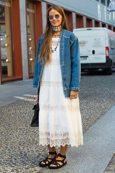 Escolha certeira, o vestido midi de renda branco é uma daquelas peças que nos deixa sempre bem vestida. Na praia, basta uma rasteirinha e cabelos ao vento. Mas o modelo também pode nos acompanhar na cidade: troque as flats de praia por um modelo mais urbano, como o de cordas da foto, e jogue uma jaqueta jeans em cima. A combinação é ideal e permite liberdade nos acessórios, que podem reiterar a allure boho da peça ou então deixá-la mais sofisticada.