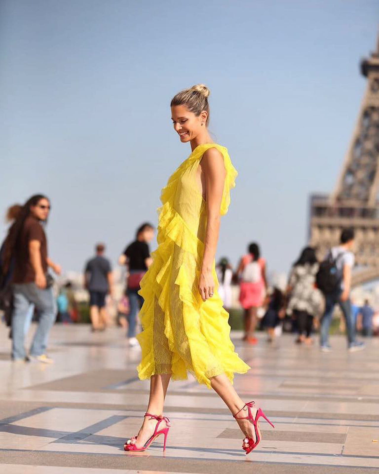 Vaporoso, com babados e uma cor viva: o vestido amarelo (cor tendência, pode anotar!) é ideal para as noites de verão. Para enfatizar o efeito noturno, cabelos presos e sandália de salto fino colorida para criar um efeito color blocking de tons análogos.