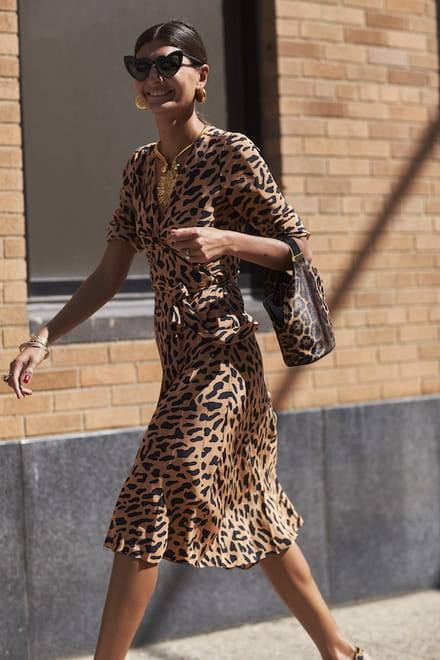 Sim, a estampa animal print ou de oncinha está de volta! Mas esqueça o peso e a associação noturna da estampa: as novas versões são leves e passam longe do over. Para acertar, aposte em um vestido de comprimento midi e longe do corpo, sobretudo nos quadris. Para combinar, bijoux douradas garantem um look femme fatale e óculos escuros divertidos quebram a seriedade do look.
