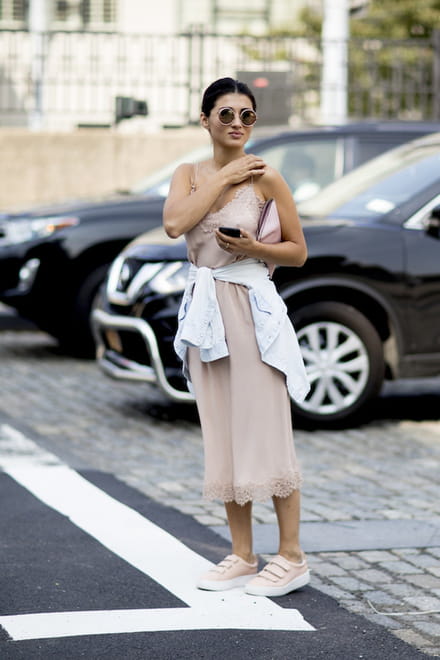 O seu slip dress ainda pode ter vida. A peça, queridinha das famosas no ano passado, volta às ruas em versão cool. Para garantir o efeito despretensioso e ao mesmo tempo feminino, aposte em tênis baixos (de preferência brancos ou da cor do vestido, como na foto) e uma camisa ou jaqueta jeans amarrada na cintura. Simples e eficaz.