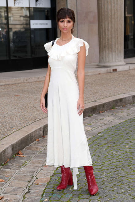 A modelo inglesa foi presença cativa nos desfiles internacionais. Para cada apresentação, ela escolheu a dedo peças com referências de moda - como este vestido branco com babados e comprimento midi. A bota vermelho fechou com chave de ouro o look para o desfile da Miu Miu durante a Semana de Moda de Paris, em outubro.