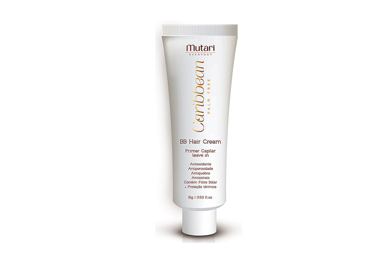 O BB Hair Cream Caribbean da Mutari agrega leave in e primer capilar em um único produto, que repõe a fração lipídica, restaura a elasticidade, dá brilho tridimensional e sedosidade. Contém microesferas de óleo de palma, sericina, creatina, ácido hialurônico, gliconutrientes e vitaminas E e F. Preço sugerido: R$ 27,00