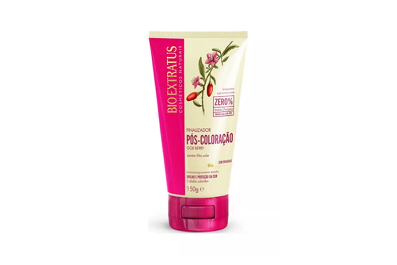 Para as mulheres com cabelos tingidos, os cuidados devem ser redobrados. O finalizador pós coloração da Bio Extratus traz propriedades antioxidantes e alta concentração de vitamina C para reparar e nutrir os fios. Conta com proteção UV e é indicado para as adeptas do Low Poo. Preço sugerido: R$ 24,59