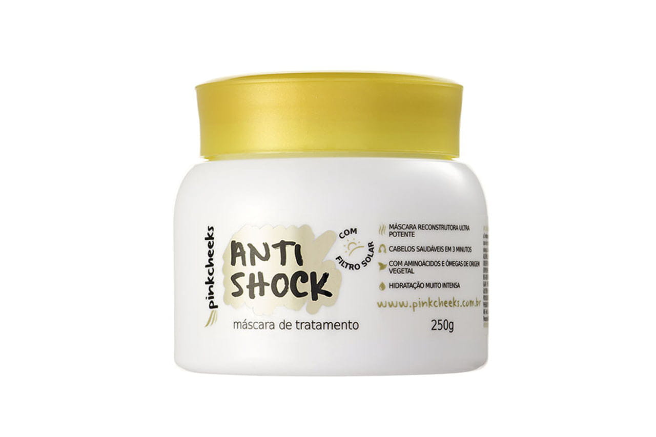A máscara Anti Shock da Pink Cheeks proporciona recuperação instantânea dos cabelos. Possui complexo bioativo de hidratação ultra potente que revitaliza os fios em apenas 3 minutos. Contém também proteção térmica e filtro solar. Preço sugerido: R$ 54,90