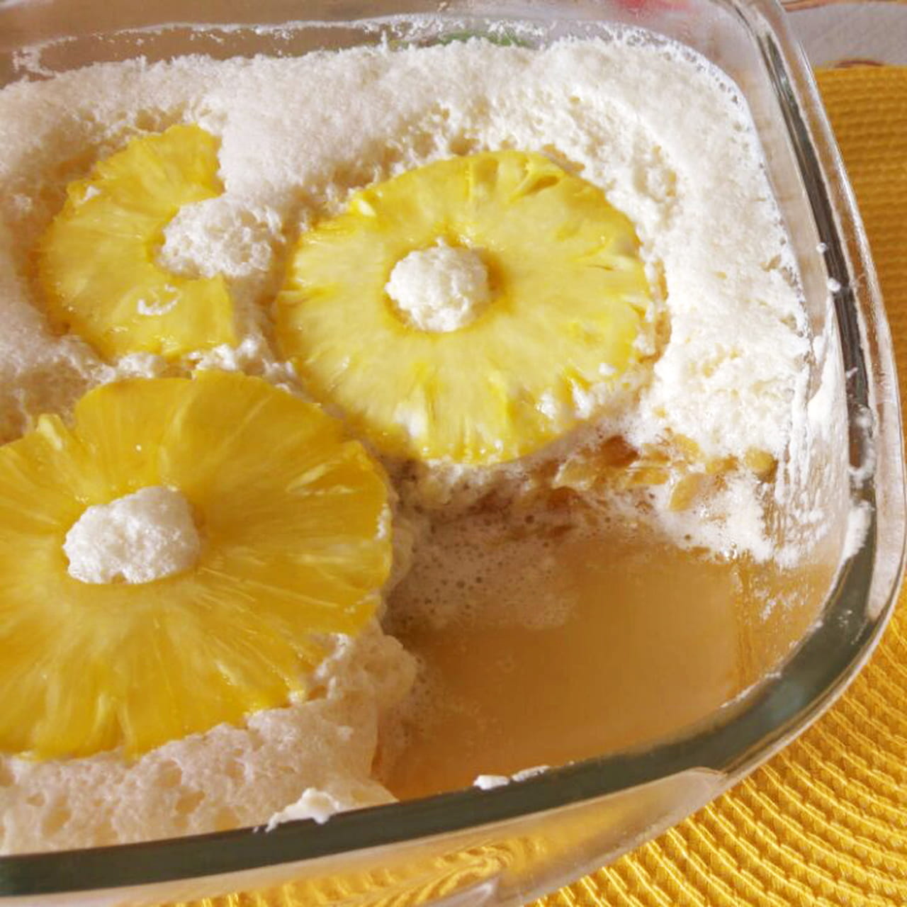 MONTAGEM: Numa travessa de vidro, coloque o abacaxi já frio e despeje por cima o creme morno. Finalize com chantilly e enfeite com o ingrediente de sua preferência (cerejas, rodelas de abacaxi, lascas de coco ou folhas de hortelã).