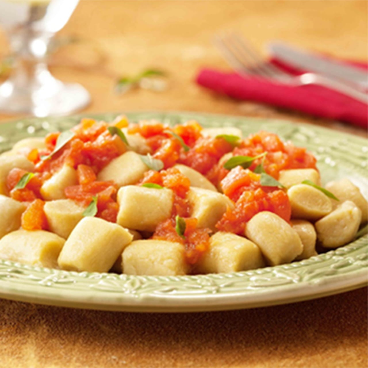 Coloque os nhoques em uma travessa e cubra com o molho de tomate aquecido. Sirva em seguida.
