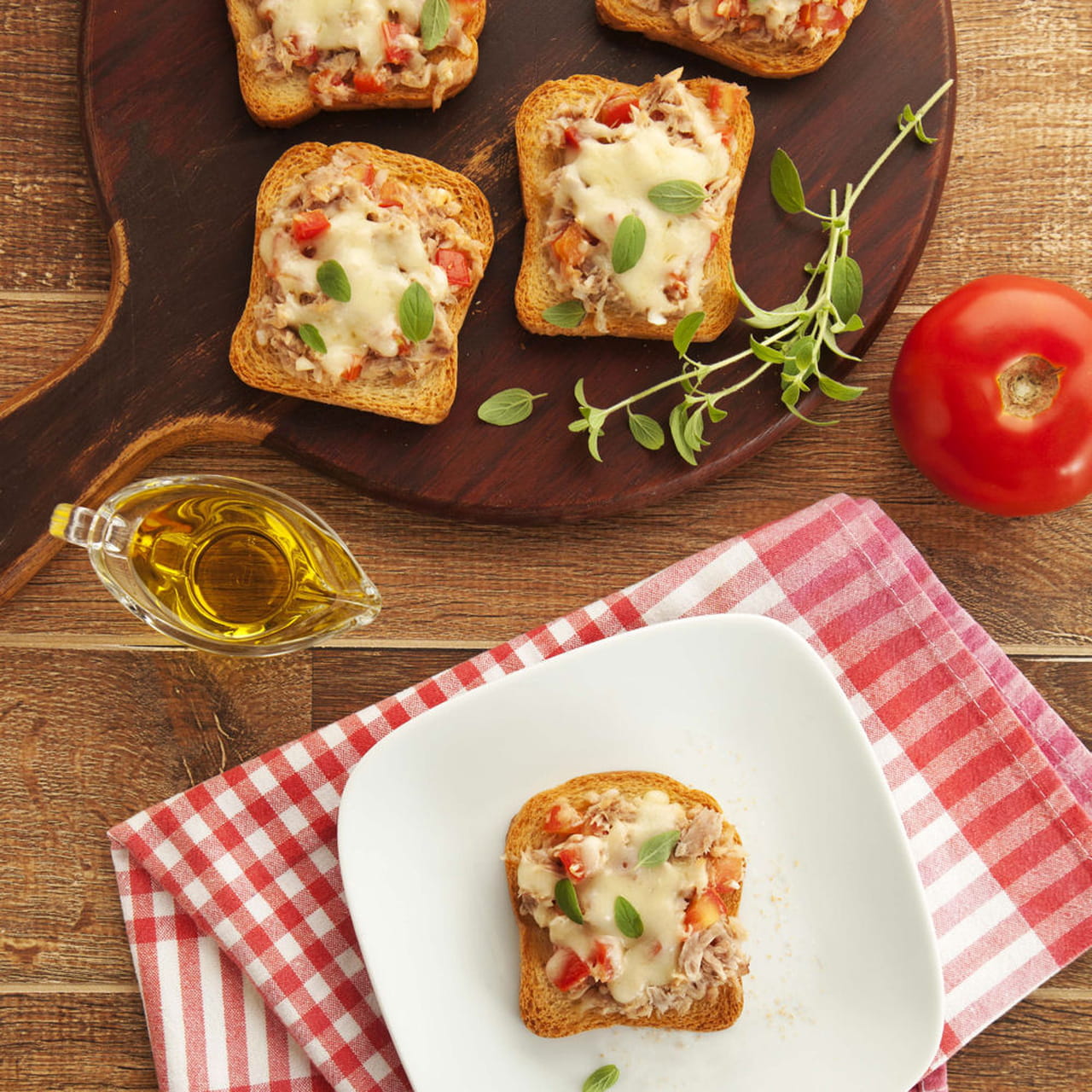 Em uma forma, distribua as torradas. Sobre cada uma, coloque um pouco do atum temperado e salpique a muçarela por cima. Leve ao forno médio, preaquecido, por 2 minutos para derreter o queijo. Retire do forno e sirva imediatamente.
