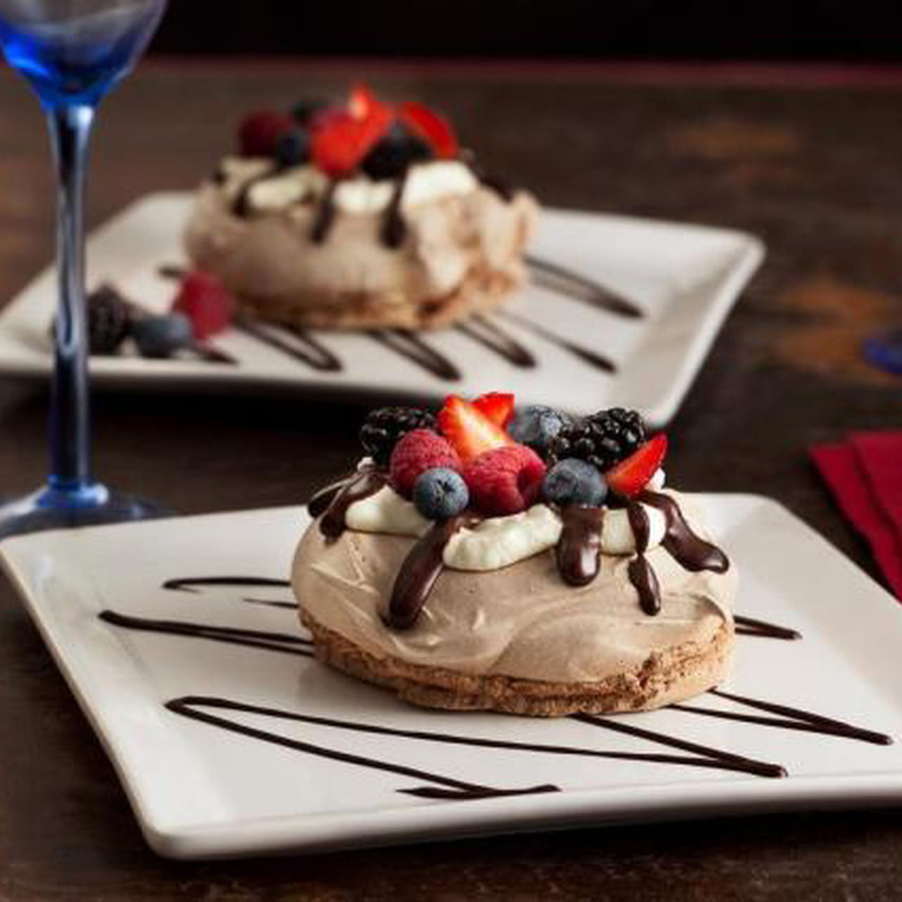 MONTAGEM: Distribua no disco de suspiro um pouco do chantilly e a calda de chocolate. Decore com as frutas vermelhas. Repita o processo com o restante dos suspiros e sirva em seguida.